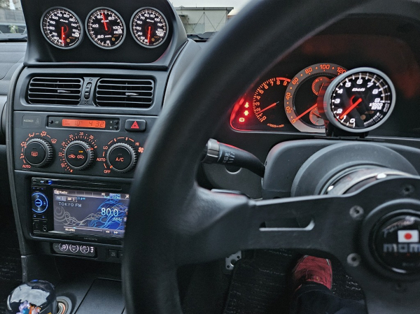 SXE10アルテッツア 追加メーター取り付けのご依頼です。Defiの油温計・油圧計・水温計をお客様にご用意いただいたメーターフードに取り付けました。メーターフードはエアコン吹き出し口上のアッパーパネルに付けましたが、パネルの切削加工が必要でした。センサーの装着にあたっては、オイルフィルター部とラジエータホース部にアタッチメントを入れております。タコメーターはステアリングコラム部に取り付け。
