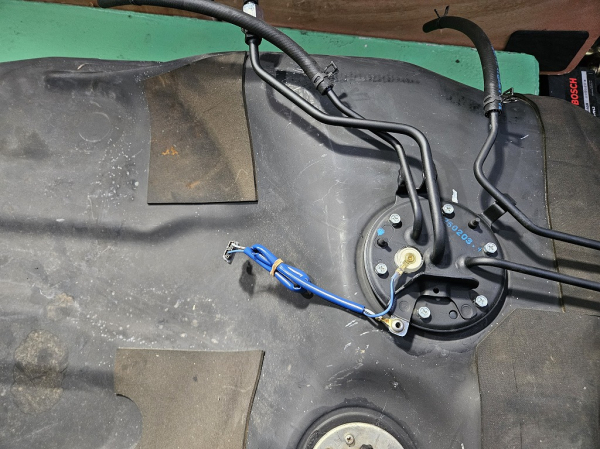 タンク側のフレアナットが付いておらず、ホースでつなげていたため燃料漏れの危険がありました。フューエルパイプは奇跡的に程度の良い中古品が有りました。フューエルパイプはエンジンルームから燃料タンクまでの1本物なので、脱着はやや大変な作業となります。燃料タンクを降ろしたついでに、タンク内の清掃と、ポンプ・ホース類を新品にしました。