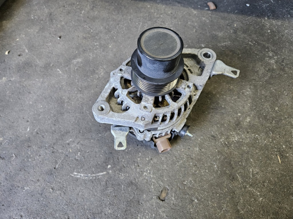 トヨタ タンク オルタネータープーリー交換M900Aタンク下り坂等でエンジンブレーキ時にたまに異音がするとの事。中々症状の確認が出来ませんでしたが、オルターネータ付近から異音がしている模様でした。オルターネータのプーリーはワンウェイクラッチを使用している為、外して見るとプーリー内部に水が入ったようで錆がまわっていました。オルターネータプーリーを交換し走行テストをして確認。症状は改善されました。