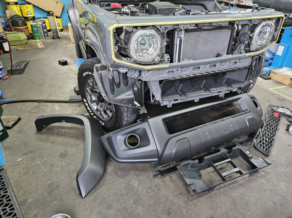 駐車中に右フロントをこすられてしまったとのことです。幸いにボディーにはダメージがありませんでしたが、バンパーとオーバーフェンダーに傷があります。バンパーやオーバーフェンダーは素地で修理が出来ない為、交換となります。バンパーを止めているビスやクリップは数があります。ロアグリルやフォグランプ等は移植し、オーバーフェンダーを交換後、バンパーを取り付けます。
